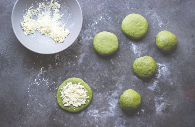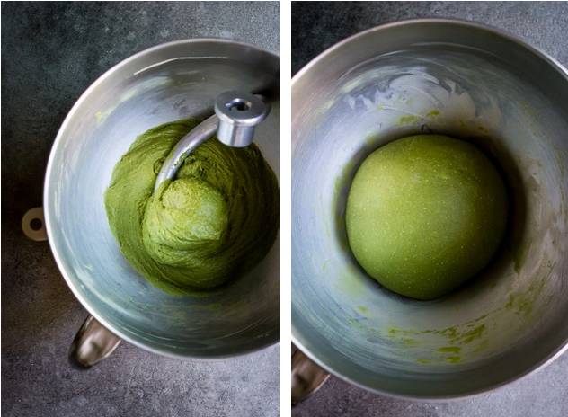 ①在平底锅中加入水,面粉和牛奶,搅拌至无结块。小火加热约3分钟,并不断搅拌,直到混合物呈现如浆糊一般的粘稠状态。关火放凉,备用。②将面粉、糖、抹茶、酵母、盐、奶粉放入盆中(食盐与酵母分开放置)。再加入牛奶、鸡蛋、香草精和步骤①中的面团。厨师机低速将混合物搅打成表面光滑团,加入软化的黄油,将面团揉至完全扩展阶段。