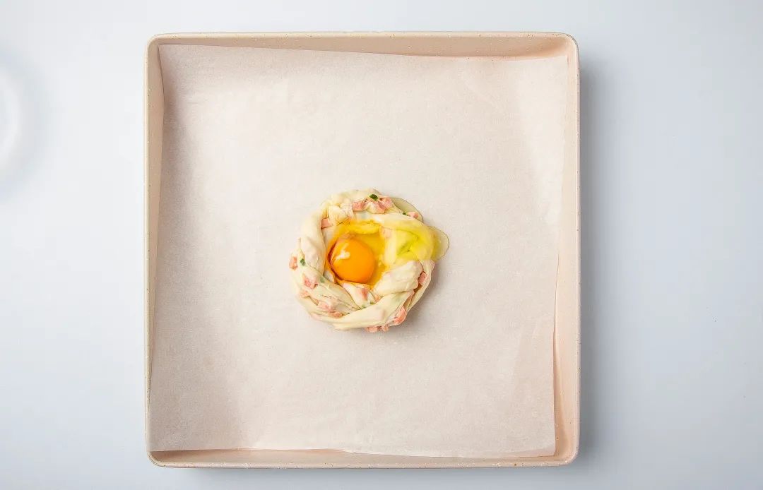 ④把编好的手抓饼围成一个圆形,在中间放入一个鸡蛋。