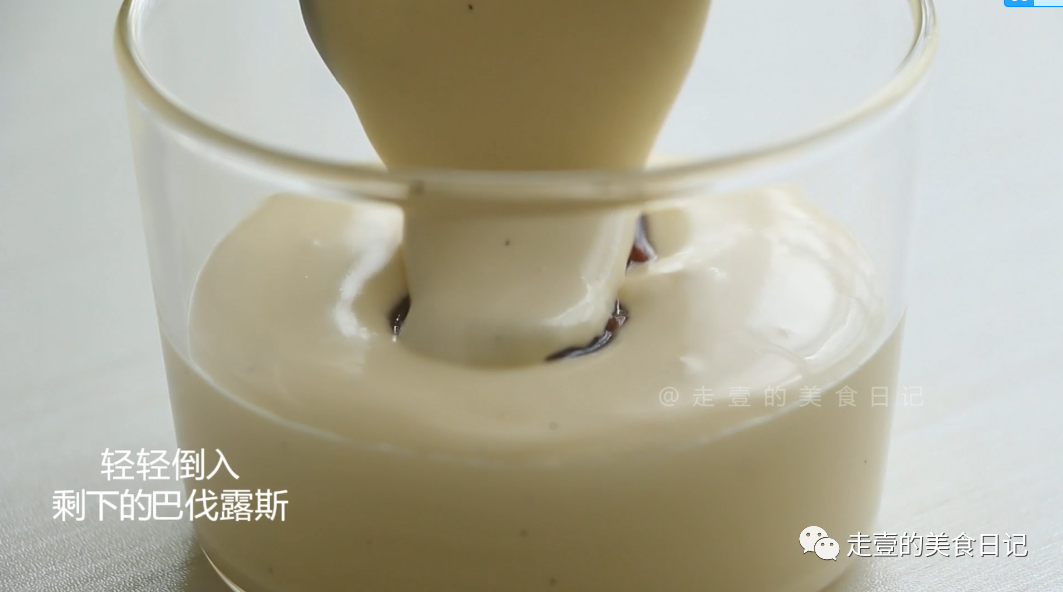 ⑥将淡奶油B打至9分发,与冷却好的蛋奶酱拌匀,即为巴伐露斯酱。
