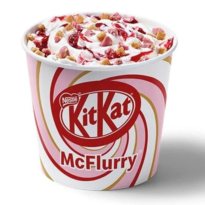 7月,麦当劳在澳洲推出了KitKat McFlurry 和 KitKat Frappé。McFlurry在冰淇淋中融入了大块的KitKat巧克力,撒上巧克力软糖;Frappé则将小块的KitKat巧克力融入沙冰和奶油顶。
