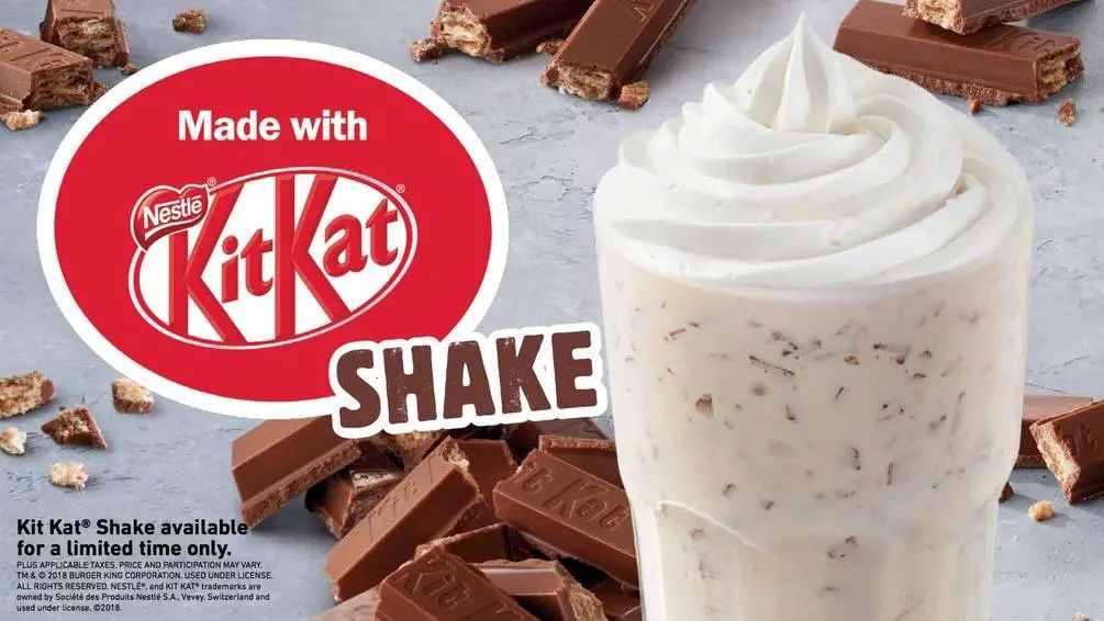 汉堡王在加拿大、西班牙等多个国家曾和KitKat合作推出过奶昔,威化巧克力为香草奶昔柔软甜香的质地增添了一份酥脆口感。