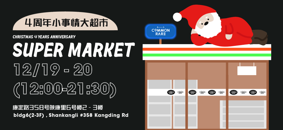 生活的便利带来的越来越多是不费力的唾手可得,是对比比皆是的事物索然无味,是无趣里寻找危险的刺激。凡几在这样的势头里,开了一间莫名其妙的超市。创意人将化身为一间间便利店,贩卖那些不便利的事物,无法快销的生意,一丝小到可以忽略不计的生活滋味。这里没有要发生大事情,也没有重金打造的兴奋,却能趁着圣诞老人的降临,捕捉某个直击心灵的时刻,不刻意、不小心。12/19-12/20在陕康里,如果你没事,来超市逛逛,与凡几一起庆祝4岁生日。As city life continues to make itself too convenient, it becomes boring as we settle down into a routine. Countering against that trend we decided to open up a Super Market where we no longer sell your typical "convenience", instead we are going to sell uniquely designed fun products that you would not be able to find at your standard convenience store! Come celebrate our 4th anniversary at Shangkangli from 12/19-12/20! (Scan mini program code above to purchase tickets!)现场关注凡几微信即可免费拿一个餐巾纸包Get a tissue pack when you subscribe to our WeChat那些生活中最不被提起的习惯,都无趣得很理所应当。睡觉要盖被子、喝水要用杯子、写字要有本子,这些无人问津的习惯,都在这里展现新的点子。这次当Lifestyle品牌都以便利店的形式出现,你又会在这里找到什么新的生活滋味?Habits that are least mentioned in life all seem boring and justified. Nonetheless, there often comes a time when these uninteresting habits birth new styles and ideas, so make sure to come explore our latest curation of local independent brands!没有什么比食物的香气更能抓住人流的脚步,熟食饮品区就是超市的灵魂所在。这里的美食酒水有比超市货架更加细腻的味蕾捕捉能力,超越速冻冰柜的烹饪等级,为这间大超市带来超越当日送达的新鲜。Nothing can catch the attention of people more than the smell of food. We believe that the hot food section of a supermarket is its beating heart. However, at our "market", the level of cooking surpasses the freshness that same-day delivery brings, which adds another layer that a regular supermarket will never have, so start your diet after the holiday season people :)想祝小朋友们圣诞快乐,暖心的innocent天真大爱小帽,带着志愿者的祝福再次和大家见面了。好喝的鲜打原果、可爱的圣诞小帽,还有现场编织志愿者体验,让小帽子的爱心好事继续发生吧。左滑查看更多照片 Scoll left to see more可爱的咖啡伙伴三顿半又来啦!「限定圣诞特饮」会有的,「特别主题周边」也会有的,升级后的“不插电吧台”,给你带来不一样的新鲜体验。这个圣诞,咖啡喝起,“超市”逛起吧。这里并不是传统超市里那些印着童话的A4文件夹,也不是蓝红分割的横条笔记本,而是生活中集满灵感点数的插画作品。你将在这里找到比彩色笔还令人兴奋的笔触,比生活还要贴切的故事情节,还有日常匮乏的灵感便利。There are no standard notebooks or notepads here, but instead we have artworks filled with inspiration from 11 independent illustrators.每次去替宠物购物时却不能问问他们的意见?这次小事情大超市宠物friendly,带他们一起逛超市吧!不管是吃的还是穿的,宠物用品区将提供属于他们的生活方式,如果你还没有宠物,这次还将现场进行宠物领养活动!This time at our 4 year anniversary event, we are going pet friendly! Bring your pet along to purse the pet supplies area for their own food and clothes. If you don’t have a pet, there will be a pet adoption section!-credit: NICETOMEETYOU这次凡几四岁生日邀请到了谭阿梨跟我们一起庆祝,她是一位独立设计师、插画师还是随机事件设计工作室创始人,小红花贩卖机品牌主理人。喜欢与植物有关的一切,喜欢不断尝试各种表现形式的创作,不愿意给自己设定界限。本次展览想要打造一个“随机超市”,展览将会拆分成很多个小的区域,除了展出大家都熟悉的“小红花贩卖机系列”的作品还将展出“花园里系列”和“my life系列”的作品。Weibo: @谭阿梨Lynn小红书 Red:@谭阿梨LynnWe are beyond excited to invite illustrator Lynn to join our 4 year old birthday bash! She was the first artist that came to our mind when we decided on our "Super Market"theme. She will be showcasing 3 different series of her artwork on 12/19-12/20!除了往常市集所聚集的独立品牌外,小事情大超市也将带来特别入驻,他们将以更加特别的形式呈现他们对生活的创意,在这一闪即逝的周末,带来把臂而谈的新奇。In addition to the usual independent brands gathering at our markets, the brands mentioned below will be taking up a few special spots. They are here to present their creativity in life on this fleeting weekend, perhaps in a form never seen before.继上次在Breaking Grounds地下市后,这一次决定干脆开个超市菜肉档:街坊老少,出去别说我们满足不了你。/“科学护肤艺术家”,UNISKIN优时颜秉承科学护肤理念,为中国消费者提供针对性抗初老护肤产品与体验,以科技驱动年轻肌态之美。这次他们品牌选取机舱概念,装置呈现“航行中”的状态,以传达UNISKIN优时颜“持续探索”的品牌理念。/PAPER VOICE® 是来自中国的奇趣生活品牌,诞生于2017年。以独特美学体系及精彩无限的创意彰显礼赠礼遇概念主旨,其产品特色是不凡的工艺与卓越的品质。如今,不断发挥创意与工匠精神,创造惊喜与奇幻、和令人意想不到的新奇物件已经成为品牌的始终追求与外在认知。这次在现场也会带来一次全新的POP-UP店!/继上一次在"一起凡几",The Melting Pot为大家进行了现场