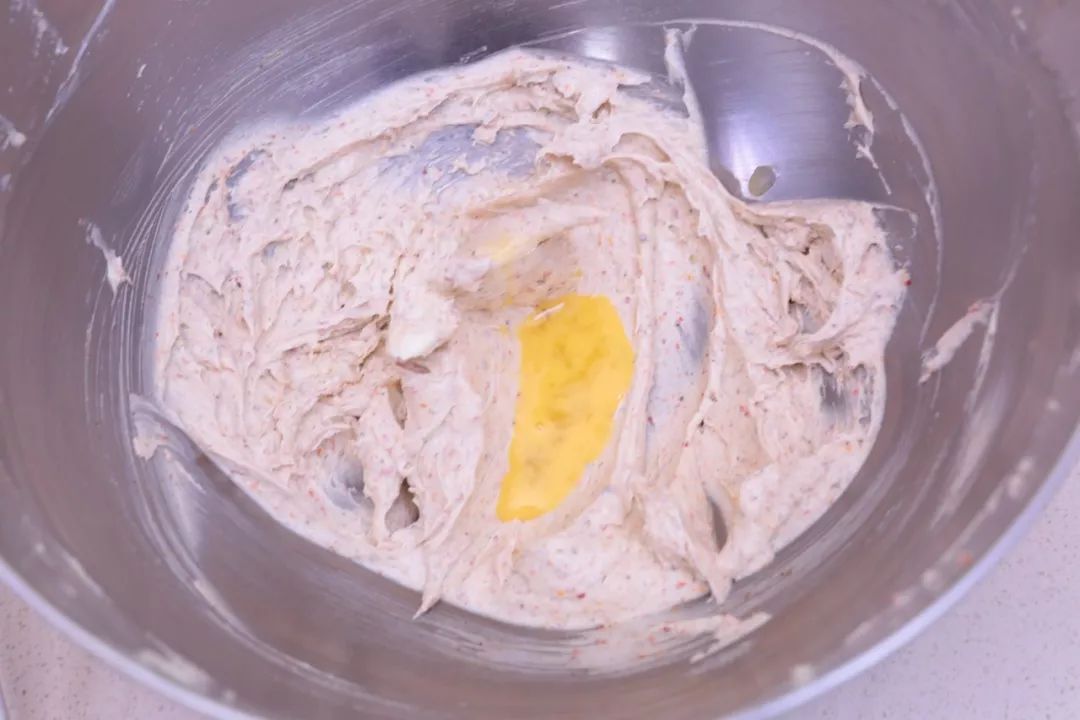 ②加入鸡蛋液打匀,筛入面粉,切拌均匀即可。