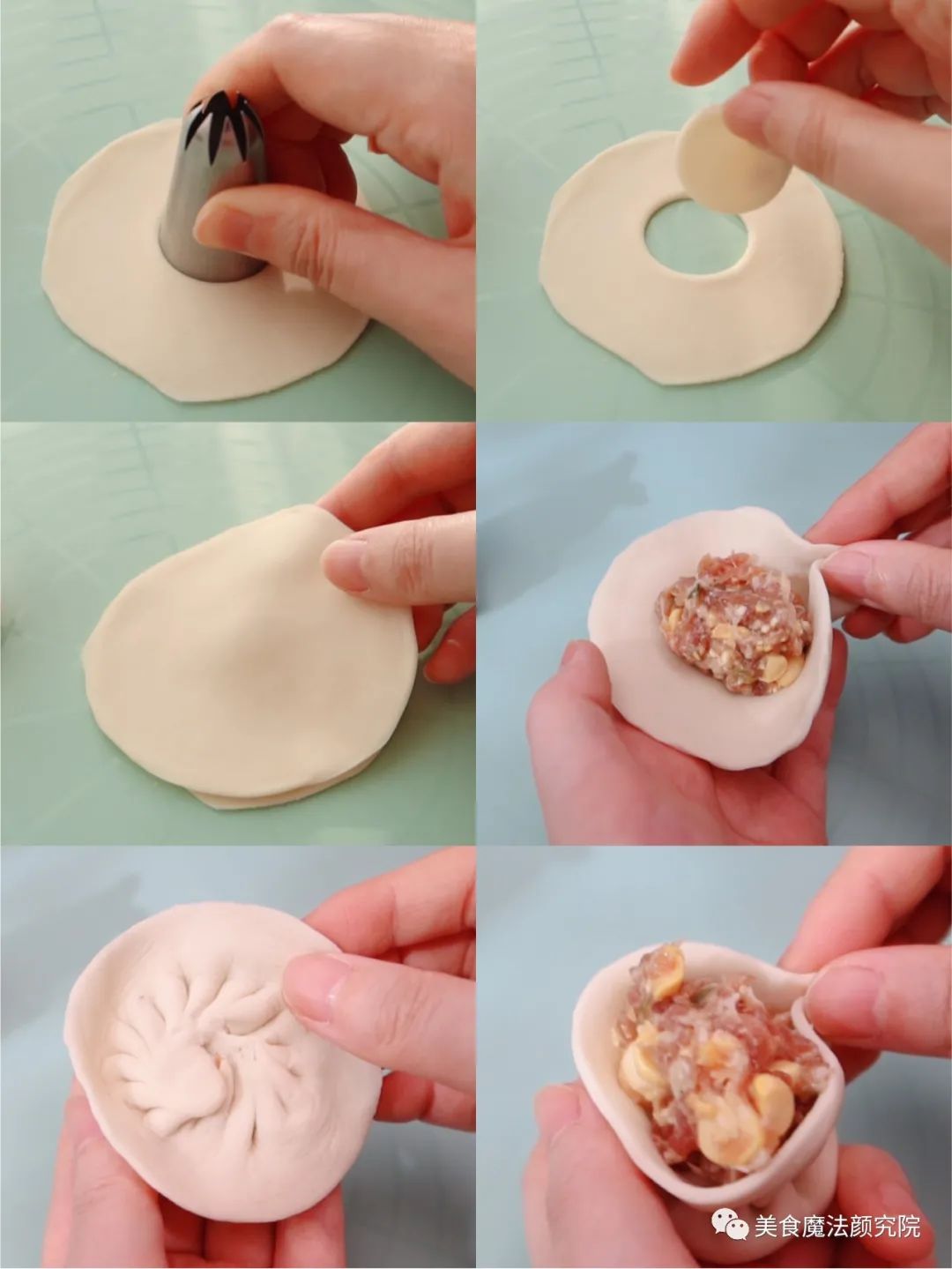 ②取15克白色面团,擀成饺子皮,中间扣个圆,再叠加一个饺子皮,包15克饺子馅,把外层饺子皮翻转过来,包15克饺子馅。