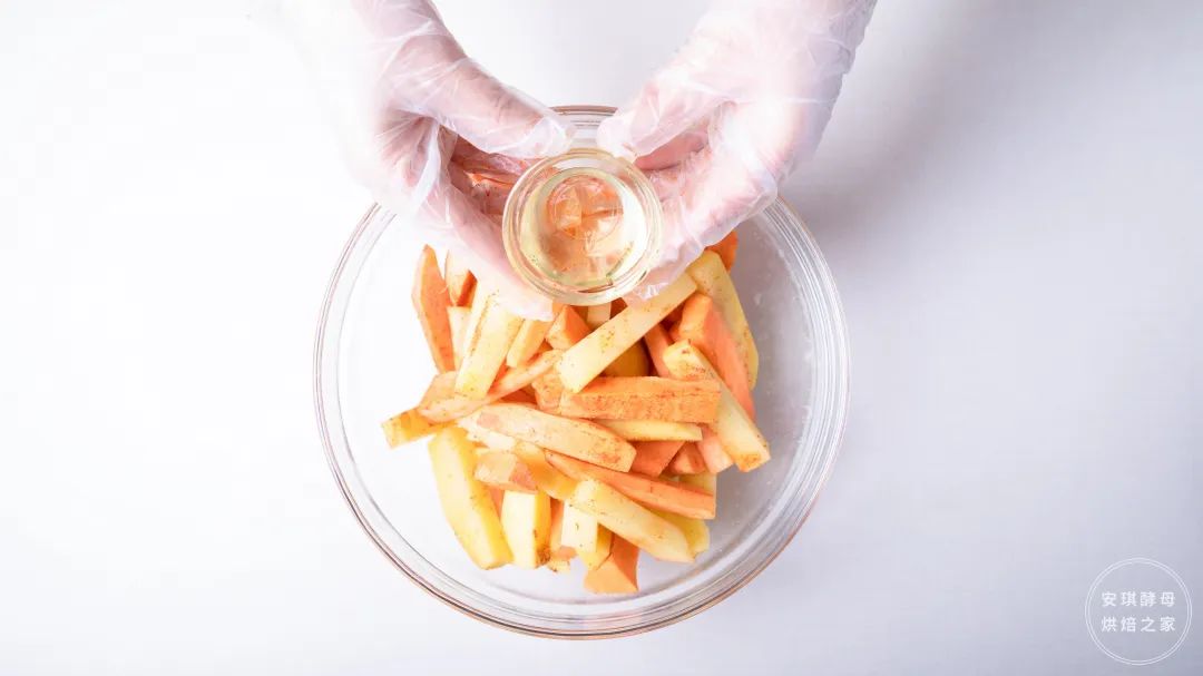 ②红薯和土豆条,加椒盐、黑胡椒粉、孜然粉、辣椒粉。