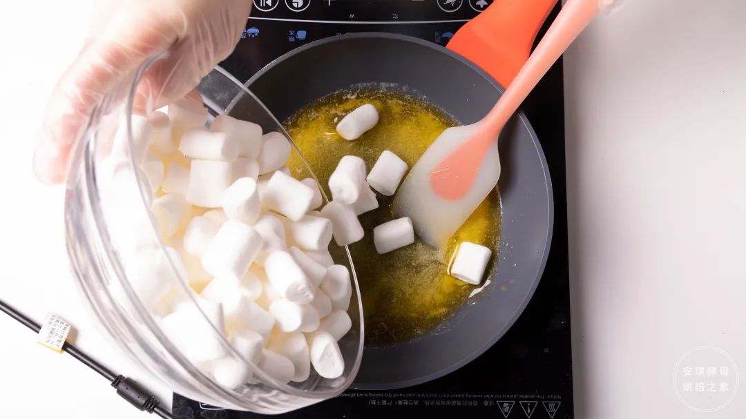 ②在平底锅里放上黄油,小火融化后放入棉花糖翻炒直至融化,关火再加入奶粉拌匀。不要翻炒太久以免变硬。