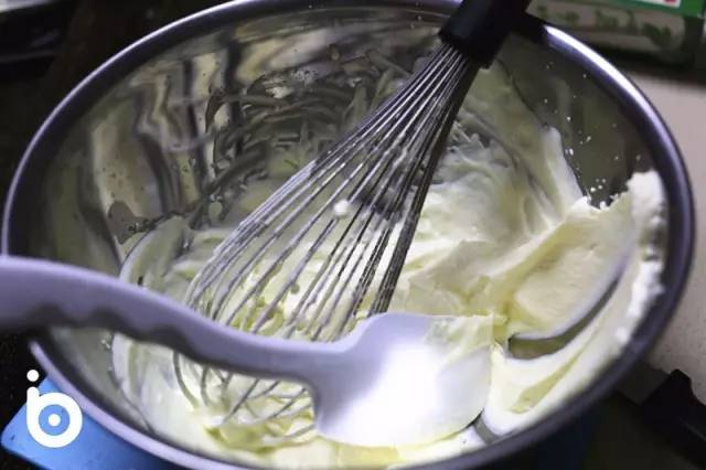 鲜奶香缇①首先将糖粉加入到淡奶油中,隔冰水将淡奶油打至8-9分发的状态(抹面裱花皆可)
