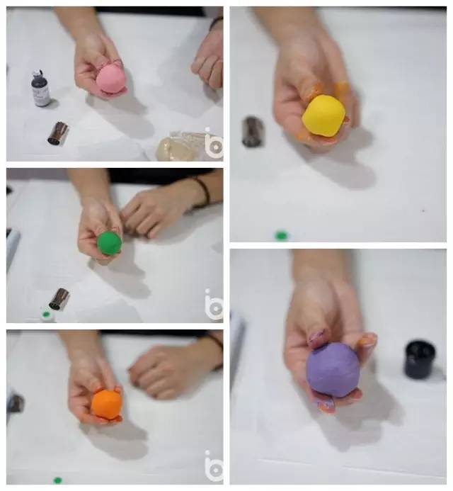 ⑥将皮的面团分好后按所需颜色加入色素调好,然后就可以着手给和果子塑形啦!