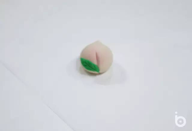 ②用手将绿色小球搓成橄榄形,压扁画纹做成叶子造型放在桃子上做装饰。