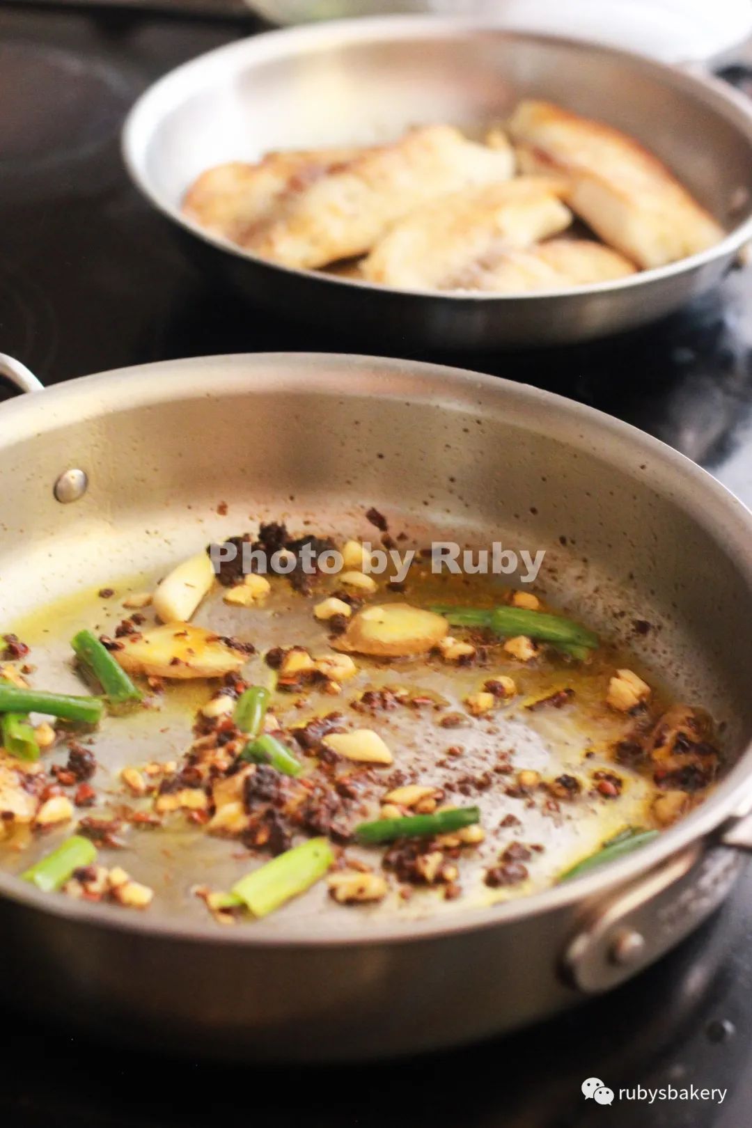 ④另起一锅(也可以用煎鱼的锅,鱼煎好后取出,不需要洗锅),热锅放油,爆炒葱姜蒜出香味,约10几秒(自家习惯,我还放了一小勺郫县豆瓣酱)