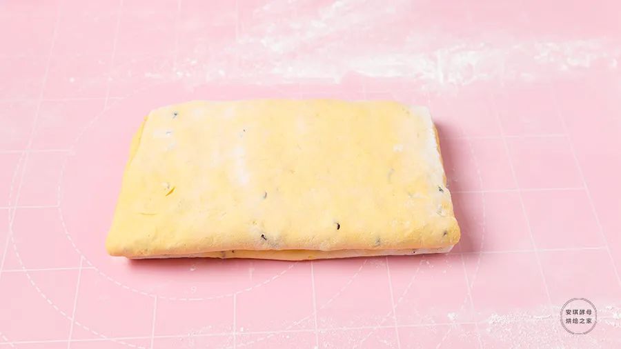 ⑥在中间位置撒少许蔓越莓干,两边对折,折叠处朝下,光滑的一面朝上。