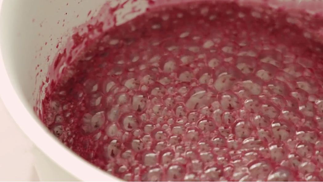 红石榴酱汁:①150g软籽红石榴倒入料理机,将果汁过滤进奶锅中。(放进料理机轻轻搅打,不用太猛把籽都打碎了)