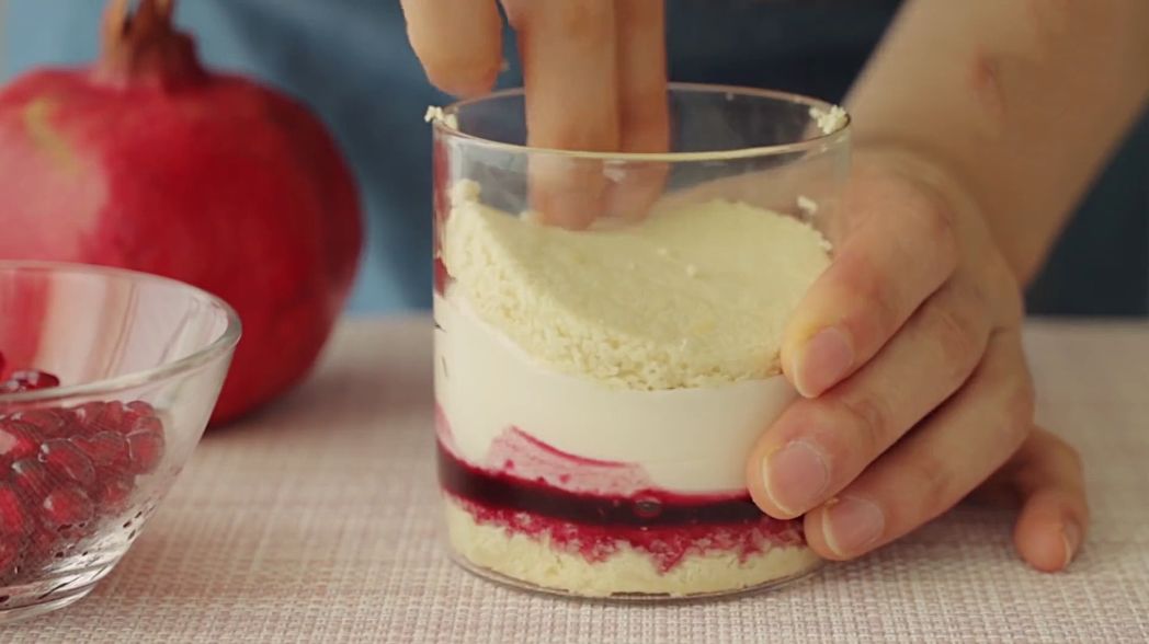 ②第一片蛋糕塞入杯底,倒入红石榴酱汁。