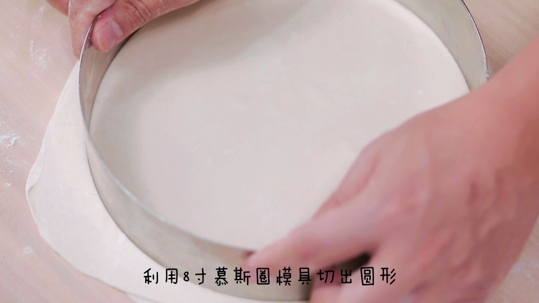 ②将油酥刷在其中一片面团上,然后将另一片面团盖上,利用8寸慕斯圈模具切出圆形