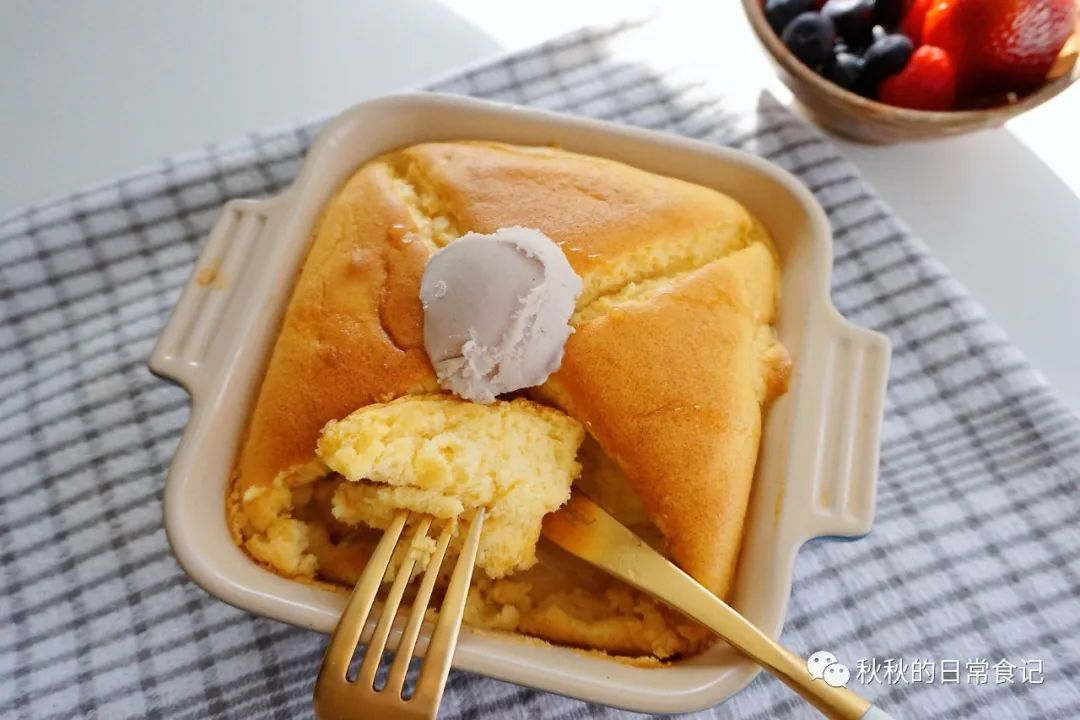参考量:1-2人份蛋白2个大鸡蛋,约75g蛋黄1个牛奶30g低粉/中粉35-40g泡打粉1/4茶匙蜂蜜10g砂糖5-10g注:一人份容器我用的是直径14厘米高4厘米的陶瓷厚烤盘,作为铸铁锅的替代。4-6寸,2-4厘米深的烤箱用容器都可以;方子味道清甜,嗜甜增加糖量。