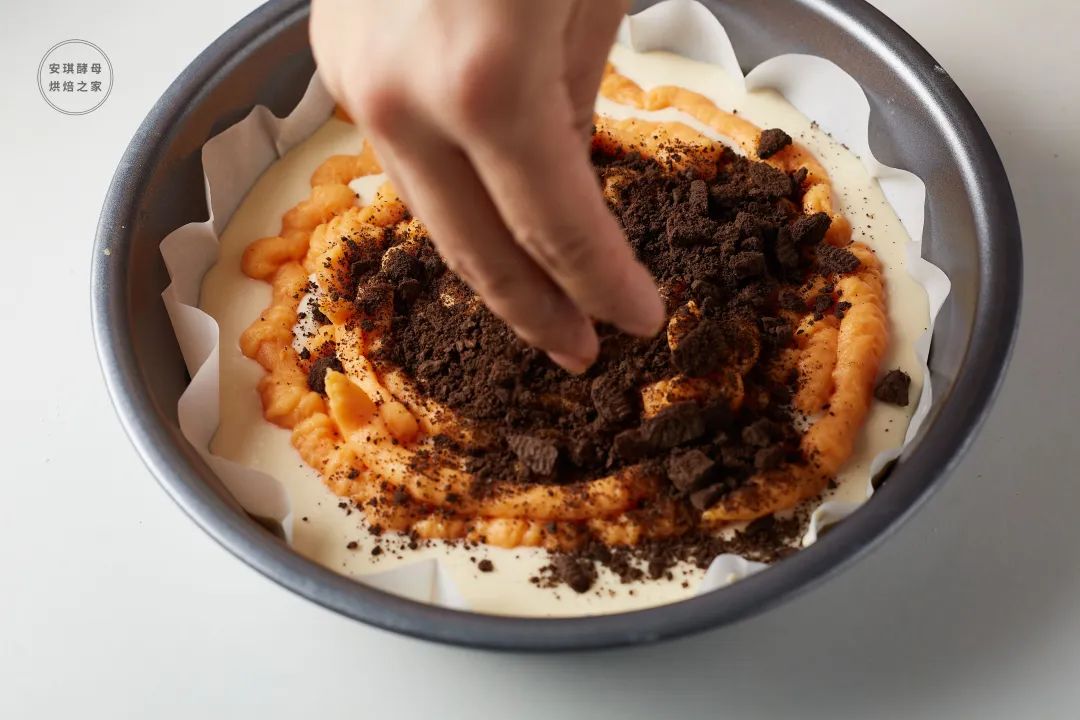 ⑤铺上一层红薯泥,撒上奥利奥碎,抹平。