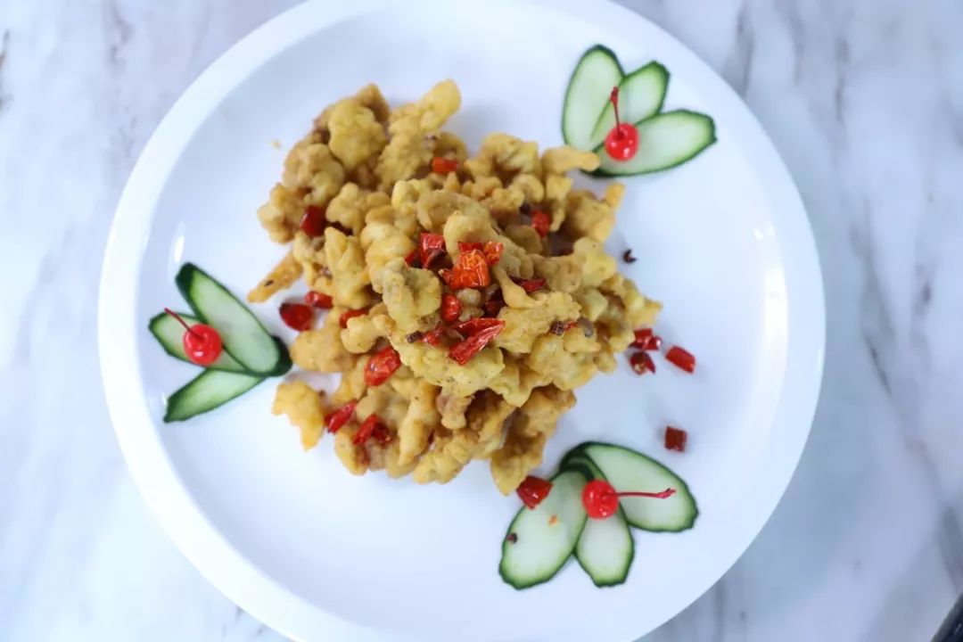 ⑦将制作好的小酥肉盛入盘中,装饰黄瓜片和樱桃即可。