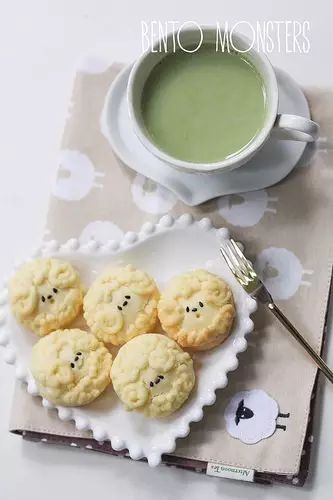 ①无盐黄油室温软化,加入糖粉打至体积蓬松、颜色变浅的状态,备用②低粉与玉米淀粉混合过筛,筛入到步骤①的黄油糊中,用刮刀拌至没有粉类颗粒的状态③从步骤②的面团中取出少许备用,其余的面团用掌心搓成圆球,成为咩咩的身子④将留出的面团填入装有细圆花嘴的裱花袋中,挤在面团的四周作为咩咩的羊毛,在上方基础羊角的造型(我不知道怎么形容了,看图吧朋友!)
