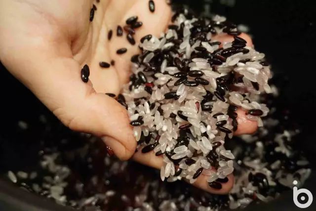 制作松仁紫米爆浆饭团①黑米提前泡一晚,之后和大米按1:1的比例,蒸熟放置室温,放入10ml寿司醋,抓到水分吸收。