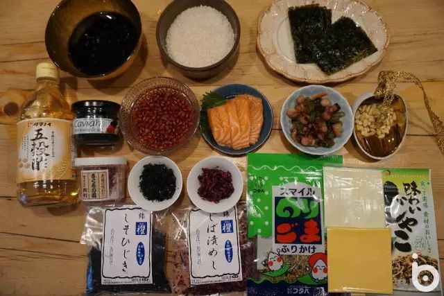 樱花紫苏饭团寿司醋10ml米饭适量泡开的樱花若干海苔(捏碎)少量芝麻拌料少量芝麻小黄瓜若干紫苏碎适量海苔片一片松仁紫米爆浆饭团寿司醋10ml松仁适量紫米饭适量车达芝士少量马苏里拉芝士少量沙拉酱适量咸蛋黄半颗海苔片一片海苔三文鱼饭团三文鱼适量米饭适量海苔(捏碎)少量芝麻拌料少量沙拉酱适量黑鱼籽适量苏子叶一片蜜豆甘栗饭团红豆适量大米适量甘栗适量蜂蜜3g白芝麻适量