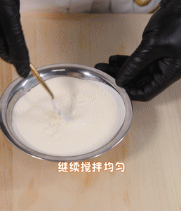 ②将牛奶加入芝士中搅拌至细腻状态,倒入模具的三分之一处,震一震后放入冰箱冷冻;