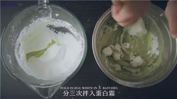 ③抹茶粉和低筋面粉混合过筛备用④蛋黄混合物中分三次加入牛奶和过筛粉(牛奶和过筛粉类间隔着加,加入牛奶混合均匀,再加粉混合均匀,重复两遍)
