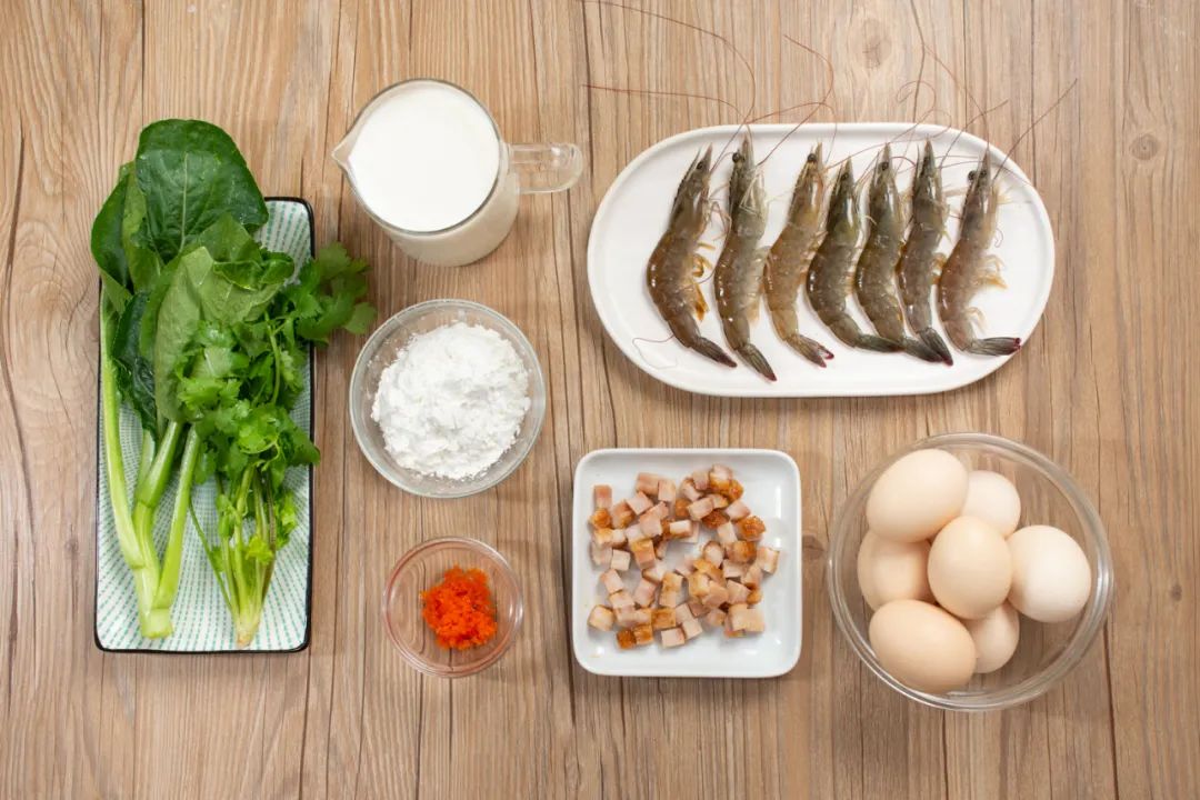牛奶 400g鸡蛋 8个叉烧粒 适量虾 7尾粟粉 50g菜心 2根蟹籽 适量香菜叶 1片生粉 适量糖 适量芝麻油 适量白胡椒 适量