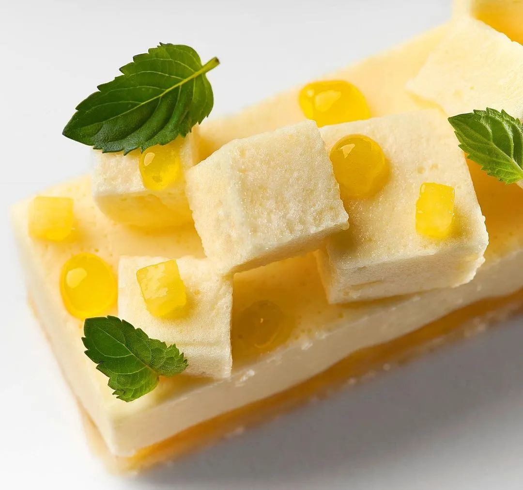 配方量:4杯烤桃子 2 个……黄桃 2 个……白桃20 克……细砂糖40 克……白桃果泥制作:1、将桃子洗净去核,切片。2、撒上砂糖,放入烤箱以160℃烘烤约20分钟。3、拌入白桃果泥,冷藏。杏仁酥脆片30 克……细砂糖15 克……面粉25 克……蛋白 8 克……黄油(融化)50 克……杏仁粉制作:1、将全部材料拌匀,在硅胶垫上擀压成片状。2、放入预热至160℃的烤箱中烘烤约4分钟。3、裁切为玻璃杯杯口直径大小的圆片,并中心打孔。4、放回烤箱再烘烤5分钟,然后出炉冷却待用。香缇奶油100 克……稀奶油 12 克……糖粉0.5 个……香草荚制作:1、将稀奶油打发,加入糖粉和香草籽(香草荚剖开刮籽)搅拌均匀。2、冷藏待用。马鞭草冰淇淋 39 克……马鞭草叶(鲜)500 克……全脂牛奶120 克……蛋黄135 克……细砂糖 25 克……青柠檬汁0.5 克……青柠檬皮屑制作:1、将35克马鞭草叶浸入煮沸的牛奶中3分钟。2、过滤到混合打散的蛋黄和细砂糖中拌匀,然后倒回锅内搅拌并加热至85℃。3、过滤到青柠檬汁、青柠檬皮屑和剩余的4克马鞭草(切碎)中。用手持均质机充分搅拌乳化后,分别注入锥形硅胶模具内(Flexipan®)。4、冷冻一小时后,脱模,卡在“杏仁酥脆片”孔中,继续冷冻。覆盆子红醋栗果酱75 克……红醋栗75 克……覆盆子(切碎)10 克……细砂糖70 克……镜面果胶制作:1、将水果与细砂糖混合在隔水加热(约70℃)。2、过滤到镜面果胶中,拌匀后冷藏。 组装&装饰1、将烤过的“白桃和黄桃”交替摆入杯子的底部,并将剩余的汁液倒入。2、将“马鞭草冰淇淋 /杏仁酥脆片”放在杯口上。3、挤上“香缇奶油”。4、制作一个白色棉花糖(淘宝有NNN多棉花糖机器,甚至儿童款都能搞定