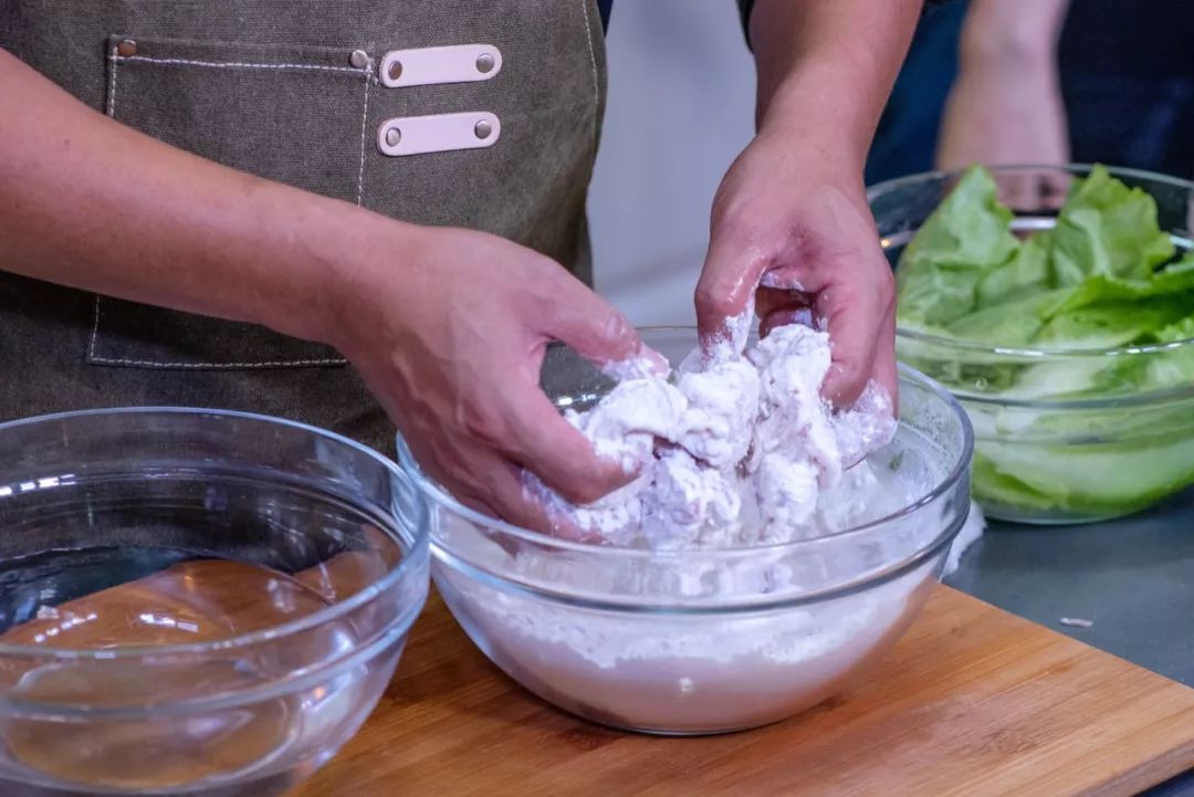 【11】裹炸粉腌好的鸡肉放入炸粉中裹好。
