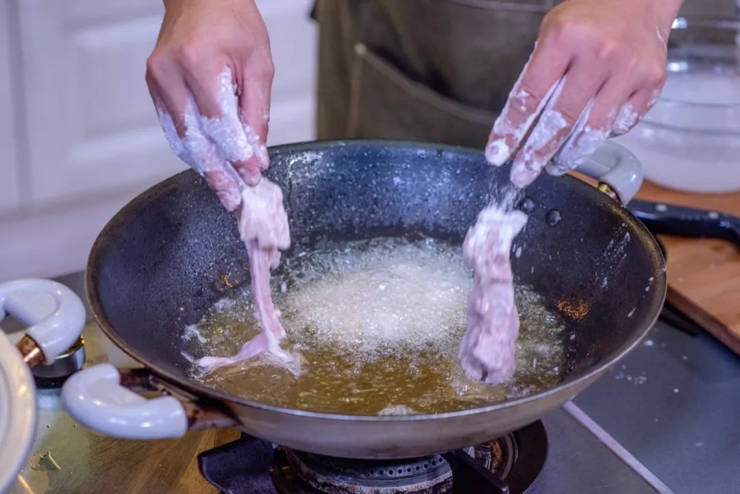【12】炸鸡将裹好炸粉的肌肉快速沾水后进油锅炸。