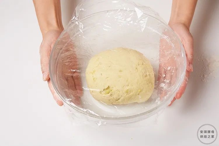 ③揉成光滑的面团后盖上保鲜膜进行发酵,直至2倍大即可,发酵好的面团就是这样的。