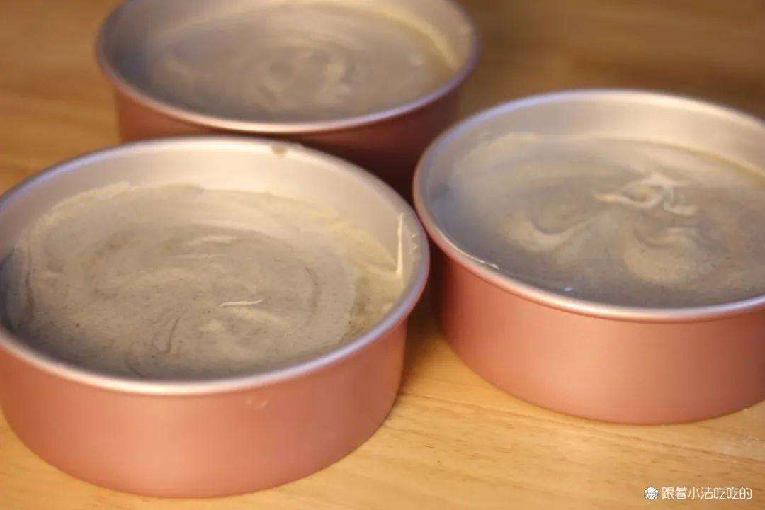⑥蛋白分三次拌入蛋黄糊中去,翻拌均匀成面糊。分装3个8寸模具中,轻震取出大气泡。