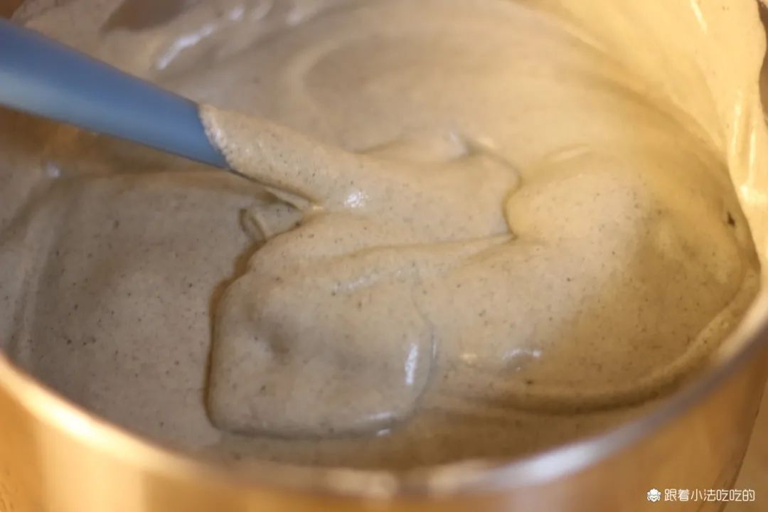 ④低筋面粉和黑芝麻粉混合过筛,筛入粉类,之字形搅拌均匀。
