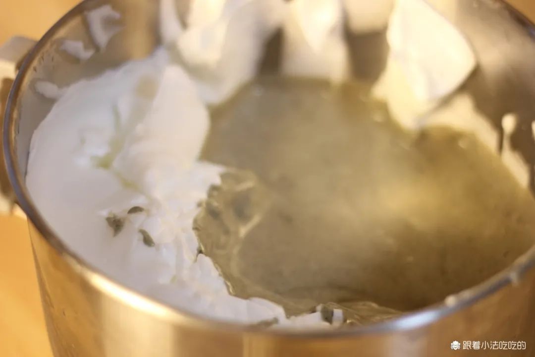 ⑤蛋白分三次加糖,加入柠檬汁,打到戚风蛋糕需要的稳定发泡状态,提起打蛋器有小三角。