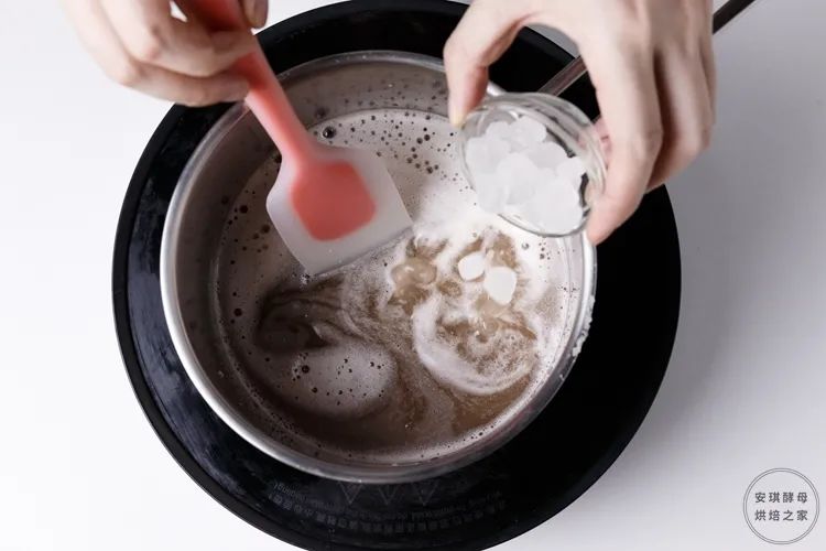 ②倒入锅中,加冰糖,中小火不停搅拌至冰糖融化。