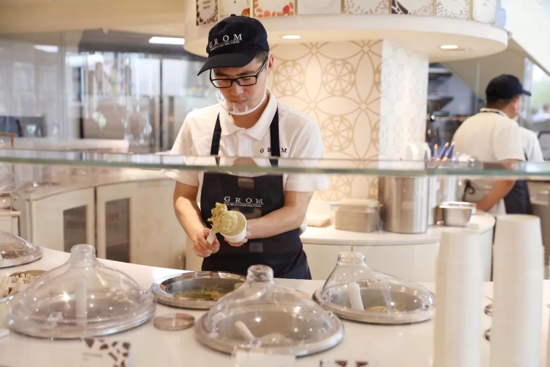 交通路线:2号线南京西路站3号口出。相信大家也都看出来了,这几家店基本上都在南京路附近转悠,来回倒地铁嫌麻烦的宝宝们,真的可以骑一辆共享单车,反正天气这么好,边吃边运动,说不定还能瘦三斤( ̄︶ ̄)↗~GROM 意大利家喻户晓的gelato,门店整体氛围偏商务休闲,有点星巴克的感觉。冰淇淋可以点杯装或是蛋筒的,大号的可以拼三个口味,小号的拼两个口味。我们点了小杯装的开心果拼咖啡和酸奶拼香草。下单之后就有小哥哥现场开始制作了~