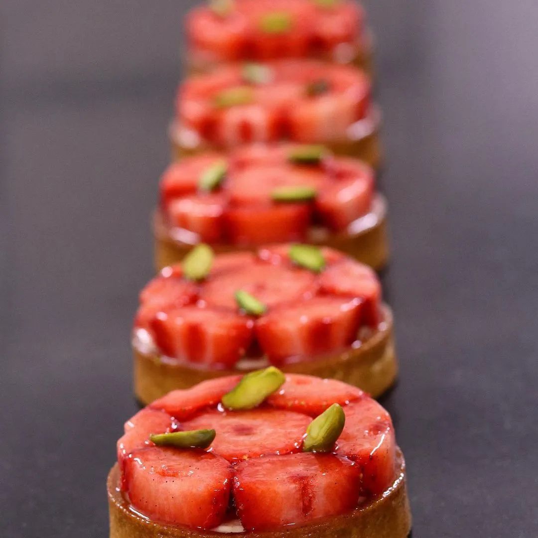 提示:↑点击上方"世界烘焙配方"快速关注cription-url="https://mmbiz.qpic.cn/mmbiz_jpg/PR7JPt3C5zawKVqAvnVjgkJkKicO3wLSfvxkngAAoDWUqJLBBmuPX3tz9EErvItMfV2IGR6HnCYhZnibRA6KM6Ww/0?wx_fmt.jpeg" data-cropselx1="0" data-cropselx2="578" data-cropsely1="0" data-cropsely2="655" data-ratio="1" data-s="300,640" src="http://www.yinpinjie.com/file/upload/202301/30/115618361.jpeg" data-type="jpeg" data-w="1080" />今天的配方是chefMickaël Ligey(下图左)带来了满足你对樱桃一切欲望的“樱桃杏仁挞”,绝不止表面这么一丢丢哦!f95p☜今日配方下载提取码每天20:30更新,每篇文末左下角“阅读原文”点击进入均可下载当日配方、视频或图片文件,省去大家自己复制黏贴的麻烦,配方文件无任何水印设置;“提取码”因近日度娘抽风搞怪,暂不提供无码下载服务,只能按她的规矩来,所以下载之前先把这个“提取码”复制一下~另外,部分地区可能因为某些不可抗原因导致无法直接点击阅读原文,可以在文末的【置顶留言】中找到链接和提取码。樱桃杏仁挞TARTELETTE CERISE ET AMANDEByMickaël Ligey配方量:6个甜挞皮/挞壳(提前1天制作)【587克】140克……黄油110克……红糖/赤砂糖270克……T55面粉 2克……海盐 65克……全蛋制作:1、将黄油与红糖搅拌均匀后加入面粉和海盐。2、搅拌至整体呈松散砂砾状时,将全蛋液加入搅拌至呈面团状,倒在工作台上手动整理成均匀厚度方块状,保鲜膜密封冷藏隔夜。3、擀压至均匀的3毫米厚度,裁切并捏入直径7厘米的挞模内,冷冻1小时后,入烤箱以160松散的烘烤15分钟。杏仁打发甘纳许(提前1天制作)【387克】250克……35%淡奶油 50克……烤熟的杏仁 80克……杏仁灵感巧克力(法芙娜) 1克……吉利丁粉 6克……冷水制作:1、将液态淡奶油与烤熟的杏仁一起混合加热煮沸,充分搅拌后离火加盖闷浸20分钟,过滤后加入适量淡奶油将液体重量补足至250克。2、再次加热后倒在巧克力上,充分搅拌乳化。3、加入吉利丁冻(吉利丁粉溶于冰水中静置至少10分钟)拌融,冷藏隔夜。樱桃卡仕达【306克】180克……淡奶油 50克……牛奶 60克……蛋黄 15克……细砂糖 1个……香草荚适量克……樱桃制作:1、将淡奶油、牛奶和香草荚(剖开刮籽)加热后冲入提前打散的蛋黄和细砂糖中,拌匀后倒回锅中中小火继续较热并保持不间断搅拌至83℃,过滤。2、将樱桃去核切半扣在挞壳底部,然后将卡仕达酱挤在挞壳内至满模具(烘烤时会隆起,冷却后会稍凹下去一点)。3、入烤箱以160℃烘烤约30分钟,出炉冷却待用。樱桃果冻【114克】100 克……樱桃果泥 2 克……吉利丁粉 12 克……冷水制作:1、将樱桃果泥加热,放入吉利丁冻(吉利丁粉溶于冰水中静置至少10分钟)拌融,冷藏3小时。2、冷藏取出,搅打后装入裱花袋,挤入冷却的挞内至满挞壳高度,抹平,冷冻,剩余的樱桃果冻继续冷藏待用于最后装饰。焦糖杏仁【150克】50克……水50克……砂糖50克……杏仁条(d'amandes en bâtons,下图)制作:1、将水和砂糖煮沸,放入杏仁条(脱皮杏仁纵向切条状)继续加热保持沸腾1分钟。2、倒在烤盘上的网架上入烤箱以160℃烘烤15分钟至杏仁表面充分焦糖化。组装&装饰10个……樱桃制作:1、将冷藏的杏仁甘纳许打发至奶油状,装入裱花袋用圣安娜花嘴以“之”字型挤在挞表面。2、缝隙处适当挤几滴冷藏的“樱桃果冻”。3、最后将切半的樱桃(刷镜面果胶)和“焦糖杏仁”装饰在表面。喜欢原汁原味继续CHEF的法语版f95p☜今日配方下载提取码每天20:30更新,每篇文末左下角“阅读原文”点击进入均可下载当日配方、视频或图片文件,省去大家自己复制黏贴的麻烦,配方文件无任何水印设置;“提取码”因近日度娘抽风搞怪,暂不提供无码下载服务,只能按她的规矩来,所以下载之前先把这个“提取码”复制一下~另外,部分地区可能因为某些不可抗原因导致无法直接点击阅读原文,可以在文末的【置顶留言】中找到链接和提取码。TARTELETTE CERISE ET AMANDEPar Mickaël Ligeypour: 6 tartelettesPÂTE SUCRÉE À LA VERGEOISE (LA VEILLE)140 g de beurre110 g de vergeoise brune270 g de farine T55 2 g de fleur de sel 65 g d'œufss entiersProcédé:1.Mélangez le beurre et la vergeoise, puis ajoutez la farine et la fleur de sel.2.Quand le mélange est sablé, ajoutez les œufs, mélangez puis frasez sur le plan de travail avec la paume de la main. Réservez une nuit au frais.3.Étalez à 3 mm d'épaisseur, foncez des cercles à tarte de 7 cm de diamètre. Laissez 1 h au congélateur puis cuisez 15 min à 160℃ à blanc.GANACHE MONTÉE À L'AMANDE (LA VEILLE)250 g de crème à 35% de matière grasse 50 g d'amandes torréfiées 80 g de chocolat inspiration amande 1 g de gélatine en poudre 6 g d'eauProcédé:1.Chauffez la crème et les amandes. Mixez puis laissez infuser 20 min hors du feu et à couvert. Repesez pour revenir au poids initial de crème demandé.2.Chauffez à nouveau, versez sur le chocolat, mixez.3.Ajoutez la masse de gélatine ( la poudre gonflée dans l'eau froide au frais) et réservez au frais pour la nuit.CRÈME FAÇON CUSTARD180 g de crème 50 g de lait 60 g de jaunes 15 g de sucre 1 u gousse de vanille qs g de cerisesProcédé:1.Chfuffez le lait et la crème avec la vanille, versez sur les jaunes déjà fouettés avec le sucre. Remettez-le tout à cuire comme une crème anglaise à 83℃.Chinoisez.2.Déposez en rosace des demi-cerises sur les fonds de tarte puis coulez l'appareil à hauteur (il va s'affaisser un peu à la cuisson).3.Cuissez 30 min à 160℃.ConFIT DE CERISES100 g de purée de griottes 2 g de gélatine en poudre 12 g d'eauProcédé:1.Chauffez la purée de cerise