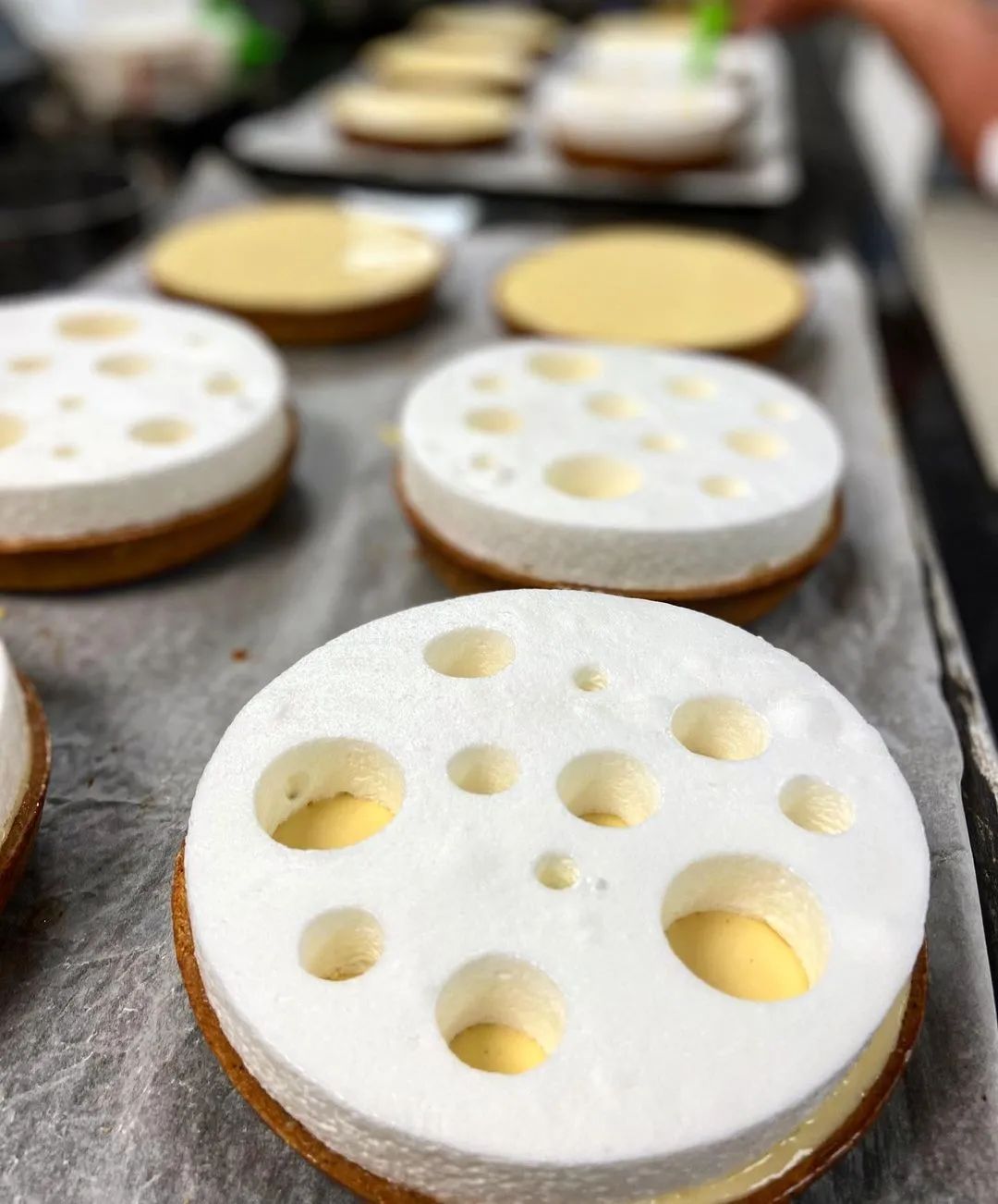 提示:↑点击上方"世界烘焙配方"快速关注cription-url="https://mmbiz.qpic.cn/mmbiz_jpg/PR7JPt3C5zawKVqAvnVjgkJkKicO3wLSfvxkngAAoDWUqJLBBmuPX3tz9EErvItMfV2IGR6HnCYhZnibRA6KM6Ww/0?wx_fmt.jpeg" data-cropselx1="0" data-cropselx2="578" data-cropsely1="0" data-cropsely2="655" data-ratio="0.38046875" data-s="300,640" src="http://www.yinpinjie.com/file/upload/202301/30/115901701.jpeg" data-type="jpeg" data-w="1280" >今天的配方是上图巴黎Ritz酒店的几款颇为有名气的甜点之一,来自chef François Perret(下图),挞大家都会做,惊奇点就是这个顶部的东东是肿么做的了,今天配方就会给你完整的答案!这是他在酒店宣传他的书籍《INSTANTS SUCRÉS》时的拍照,书是法语版,如果你喜欢他的作品,可以买来看看,T宝就可以买到的哦~zkm2☜今日配方下载提取码每天20:30更新,每篇文末左下角“阅读原文”点击进入均可下载当日配方、视频或图片文件,省去大家自己复制黏贴的麻烦,配方文件无任何水印设置;“提取码”因近日度娘抽风搞怪,暂不提供无码下载服务,只能按她的规矩来,所以下载之前先把这个“提取码”复制一下~另外,部分地区可能因为某些不可抗原因导致无法直接点击阅读原文,可以在文末的【置顶留言】中找到链接和提取码。蜂巢柠檬挞TARTE AU CITRON EN LÉGÈRETEPar François Perret (Le Ritz, Paris)甜挞皮/挞壳【581.5克】150 克……黄油 95 克……糖粉 30 克……杏仁粉 55 克……全蛋(1个) 1 克……盐之花(海盐)0.5 个……香草荚250 克……T55面粉制作:1、将软化的黄油与糖粉和杏仁粉混合搅拌,加入全蛋、盐之花与香草籽(香草荚剖开刮籽)。2、加入过筛的面粉,搅拌至均匀的面团状态,保鲜膜包好,冷藏1小时至其变硬。3、将面团擀压至2毫米的均匀厚度,捏入挞壳中,以160℃烘烤20分钟。柠檬奶油【800克】184 克……黄柠檬汁 2 个……黄柠檬皮屑184 克……细砂糖170 克……全蛋260 克……黄油制作:1、将柠檬汁、柠檬皮屑和1/2量的细砂糖放入厚底平底锅中加热。2、将全蛋与剩余的1/2细砂糖搅打至泛白,倒入“步骤1”的热柠檬汁拌匀。3、再将“步骤2”全部倒回锅中以制作卡仕达的方式搅拌加热,煮沸后继续加热3分钟,期间保持不间断搅拌。4、过滤后加入黄油,用手持均质机充分搅拌乳化至细腻。杏仁柠檬奶油馅【200克】30 克……全蛋液40 克……细砂糖40 克……杏仁粉90 克……柠檬奶油(配方↑)制作:1、将全蛋与砂糖搅打至泛白,加入杏仁粉拌匀,加入90克柠檬奶油(剩余的柠檬奶油留作最后装饰使用),混合拌匀后装入烤熟的挞壳内,入烤箱以160℃烘烤4分钟。蜂巢柠檬蛋白霜【262克】 2 克……吉利丁片150 克……蛋白110 克……细砂糖制作:1、将吉利丁片浸泡于冰水(配方之外)中至其软化。2、将蛋白和细砂糖在搅拌缸中用球桨中低速打发,注意不要过度打发,加入冰水泡软并融化的吉利丁拌匀,装入裱花袋。3、将高度1.5 CM的挞圈内壁涂抹薄层黄油,放在同样涂油的烤盘上。4、将“步骤2”的蛋白霜挤入挞圈内,用L形抹刀抹平表面,放入蒸汽烤箱内80℃烤3分钟,如果没有蒸汽烤箱,可以用微波炉以最高活力加热(不得超过15-20秒),烤好后脱模,冷却,用小圆模具切割出直径不同的圆孔洞。组装&装饰1、在烤熟并冷却的挞的“杏仁柠檬奶油馅”上挤满一层“柠檬奶油”,抹平。2、将“蜂巢柠檬蛋白霜”放在挞上,在其小孔中挤入剩余的“柠檬奶油”。喜欢原汁原味继续CHEF的法语版zkm2☜今日配方下载提取码每天20:30更新,每篇文末左下角“阅读原文”点击进入均可下载当日配方、视频或图片文件,省去大家自己复制黏贴的麻烦,配方文件无任何水印设置;“提取码”因近日度娘抽风搞怪,暂不提供无码下载服务,只能按她的规矩来,所以下载之前先把这个“提取码”复制一下~另外,部分地区可能因为某些不可抗原因导致无法直接点击阅读原文,可以在文末的【置顶留言】中找到链接和提取码。TARTE AU CITRON EN LÉGÈRETEPar François Perret (Le Ritz, Paris)PÂTE SUCRÉE150 g de beurre 95 g de sucre glace 30 g de poudre d'amandes 55 g d'œufs (1 œuf) 1 g de fleur de sel0.5 u gousse de vanille250 g de farine T55Procédé:1.Mélangez le beurre pommade avec le sucre glace et la poudre d'amandes. Ajoutez l'œuf, la fleur de sel et les graines de la demi-gousse vanille.2.Tamisez la farine, puis incorporez-la et mélangez délicatement jusqu'à obtention d'une préparation homogène. Débarrassez, filmez et laissez durcir 1 heure au réfrigérateur.3.Abaissez la pâte sur 2 mm d'épaisseur à l'aide d'un rouleau à pâtisserie. Foncez des cercles à tartelette. Enfournez pour 20 minutes à 160℃.CRÈME AU CITRON184 g de jus de citron jaune 2 u de zestes de citron184 g de sucre semoule170 g d'œufs260 g de beurreProcédé:1.Dans une casserole, faites chauffer le jus et les zestes de citrons avec la moitié du sucre.2.Faites blanchir les œufs en les fouettant avec le sucre restant, puis versez la préparation chaude dessus.3.Remettez à cuire comme une crème pâtissière, en comptant 3 minutes après ébullition et en remuant sans cesse.4.Passez au chinois sur le beurre, puis mixez à l'aide d'un mixeur plongeant.CRÈME AMANDE-CITRON30 g d'œuf40 g de sucre semoule40 g de poudre d'amandes90 g de crème au citronProcédé:1.Faites blanchir le demi-œuf en le fouettant avec le sucre. Incorporez ensuite la poudre d'amandes, puis 90 g de crème au citron (réservez le reste, qui sera utilisé pour garnir les tartes à hauteur). Mélangez, puis pochez sur les fonds de tartelette précuits. Remettez à cuire au four pendant 4 minutes à 160℃.BLANC EN NEIGE AU CITRON 2 g feuille 
