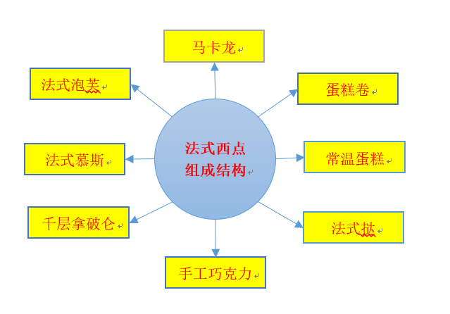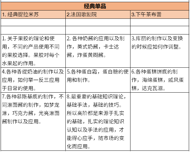 学习的概述系统专业了解甜点1.讲解法式基础知识2.讲解慕斯理论〔充分的了解,才能更好学习〕实操问题解决3.讲解关于原材料知识讲解4.大小工具的选择〔 对原材料和工具的把控让你在厨房得心应手〕实际变换运用5. 各种果胶的作用,如苹果胶NH果胶,三仙胶,黄原胶等等这些果胶的作用以及如何去变换着应用起来;各种糖在甜点里面应用的作用和多个用途;黄油在各个甜点中所起的作用以及每个不同类别的甜点所需要的温度等。6. 各种奶酱如:重蛋黄酱,轻蛋黄酱,英式奶酱,蛋白霜,意式、法式、瑞士,卡仕达酱,各种果酱,莓果酱,柠檬酱,各种酱的运用,以及多用途(应用在马卡龙,泡芙,蛋糕卷)等等在甜点里面了的作用以及如何举一反三的去调配自己想要的味道,以及如何去更换着实际去应用。〔容易被忽略的食材中却蕴含着制作甜点的奥秘 〕