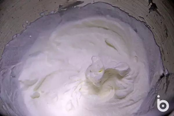 ③等待的时候,可以准备好奶油霜的材料,在淡奶油中加入砂糖,将奶油霜打发至8分,提起打蛋头的时候,奶油呈挺立状态。