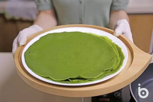 ④取摊好的饼抹上奶油霜,再均匀撒上略切碎的蜜豆,接着叠上另张饼,重复这个过程。完成后将两边的饼皮折起,像做春卷一样将馅料卷起,上端用筛子撒上抹茶粉就完成啦!