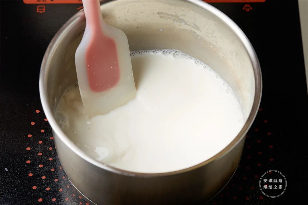 ②开小火,不断搅拌,至浓稠,放入冰箱冷藏备用。