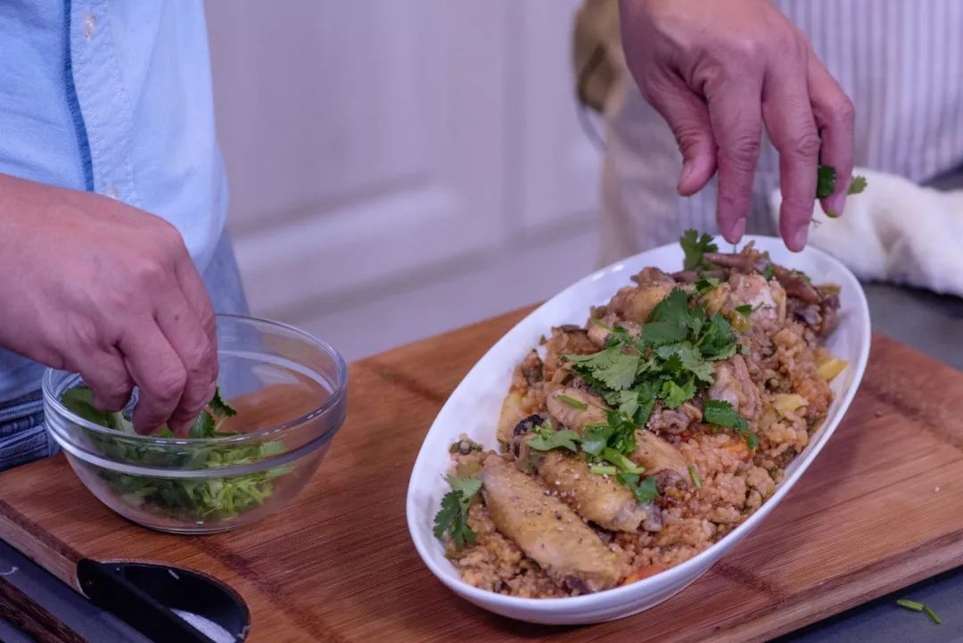 【9】摆盘将鸡翅整齐地排列在香浓的米饭上,再撒上黑胡椒和香菜调味。