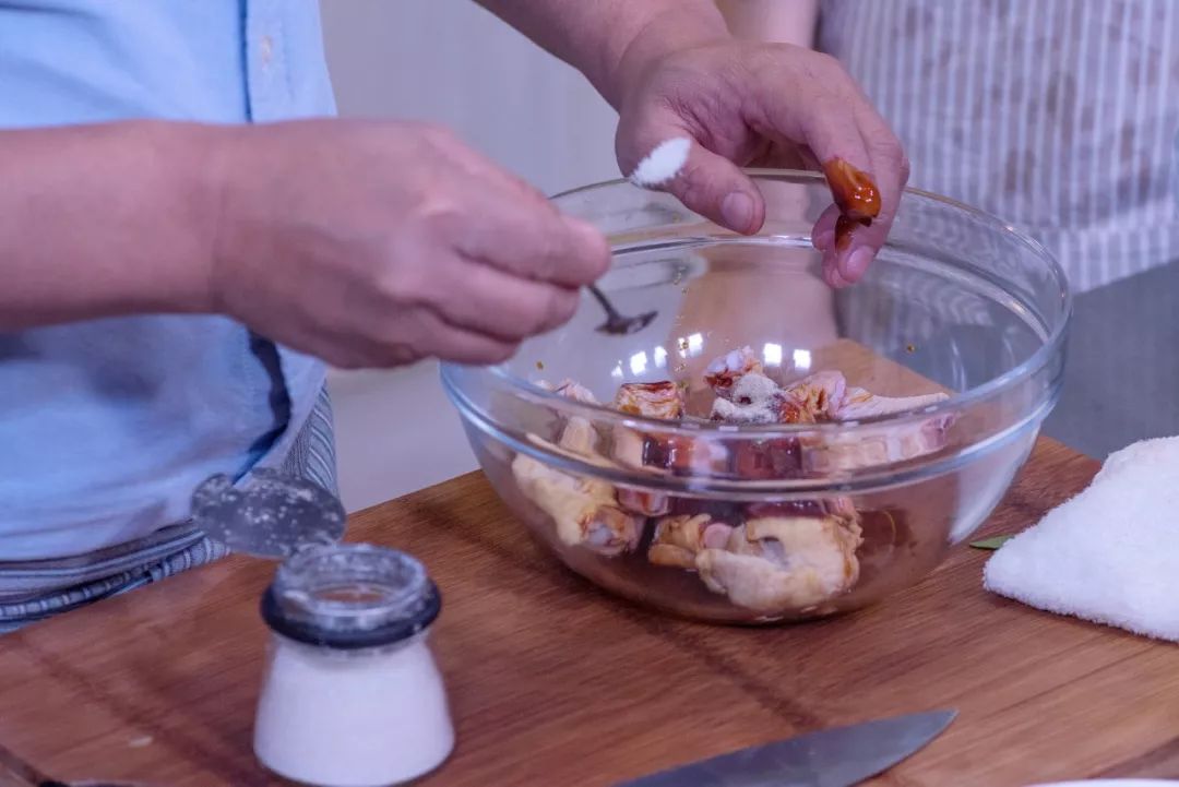 【6】调酱汁在腌制鸡翅的碗中加入泡发香菇的水,在计入适量酱油、芝麻油、孜然粉、适量的水。