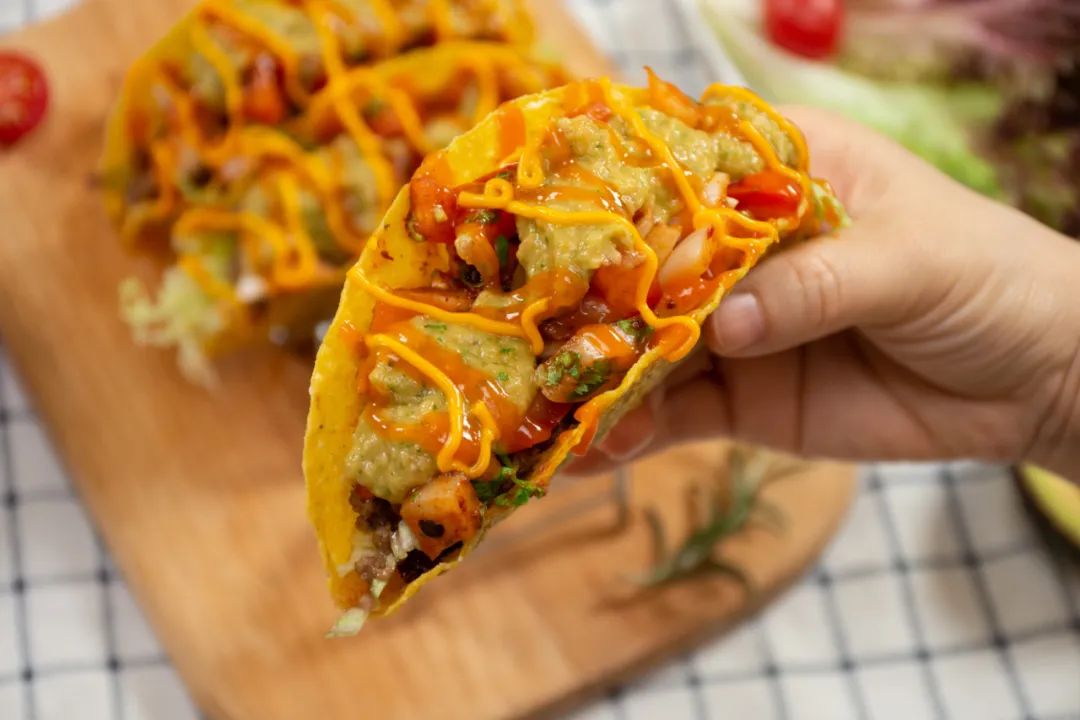 不过今天我们要做的这个Taco,外面的玉米饼皮是脆的,这是Taco从墨西哥进入美国后的新吃法。因为是脆皮,所以咬下去会“咔嚓”一下,得到一个酥脆的口感,牙齿和耳朵都超级满足,再配上传统Taco的灵魂搭配:莎莎酱,清甜的西红柿和脆爽的洋葱,带来丰富水润的口感~这么一口,酥脆、油脂香、蔬菜的水分就都有了,舌尖上的丰富滋味~