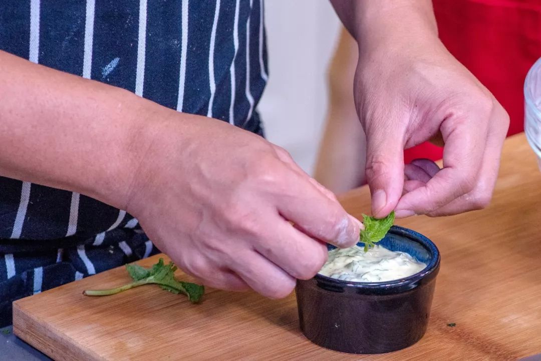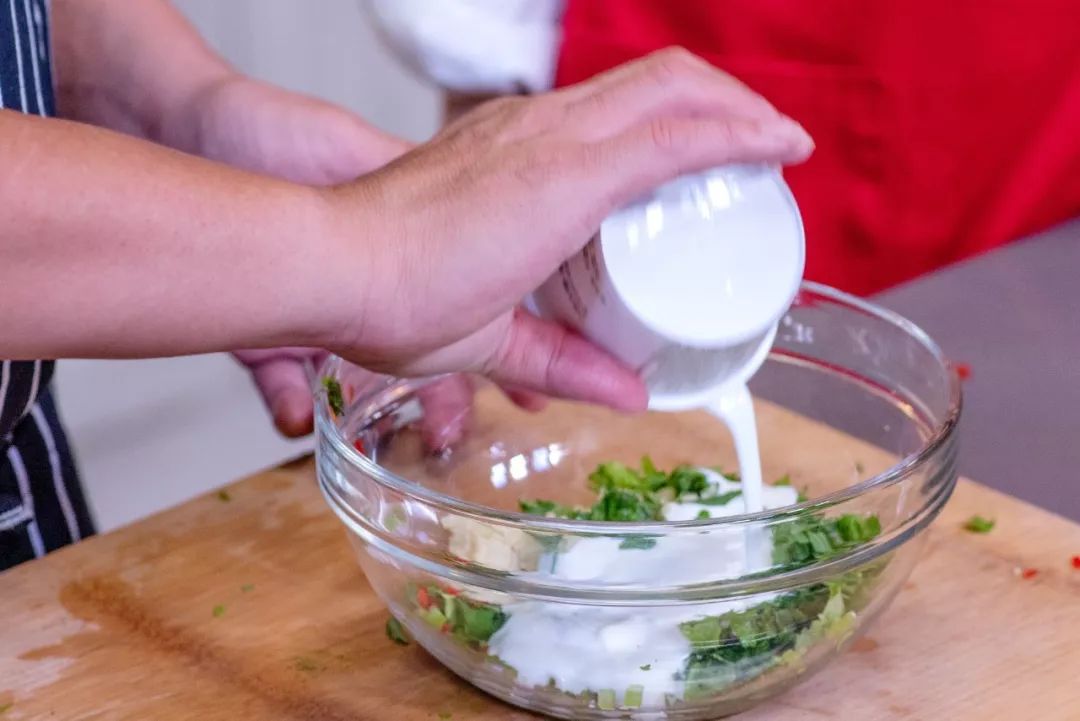 【5】做酸奶酱将青椒、香菜、红椒、蒜末、薄荷叶放入碗中,加入适量的酸奶。