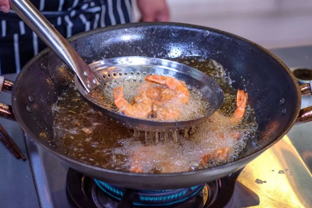 ▼炸虾的油温控制在160~170℃之间。
