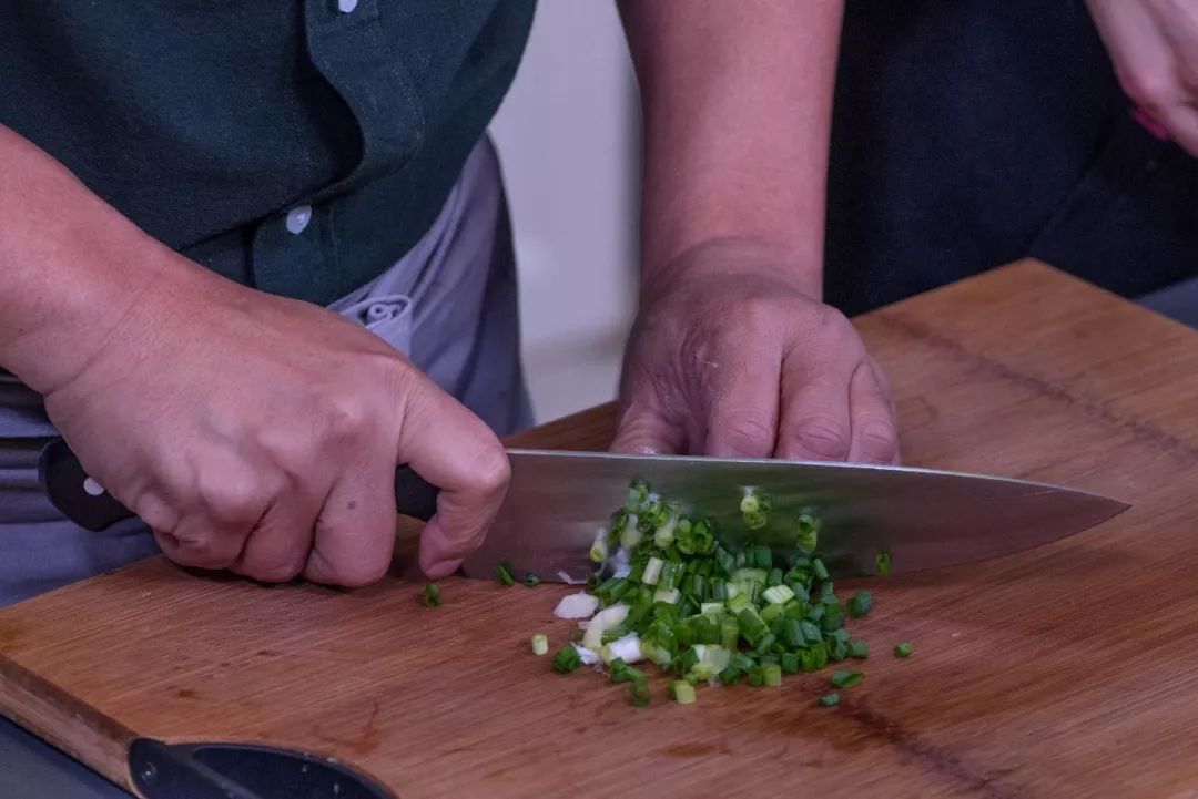 【2】处理辣椒用剪刀将辣椒剪成段,用漏勺滤除辣椒籽备用。