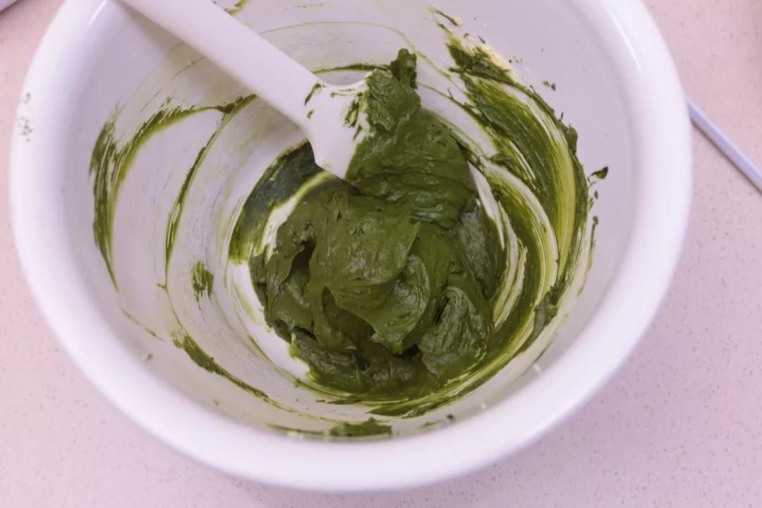 同理制作抹茶馅:黄油加砂糖拌匀,加入淡奶油、调好的抹茶酱拌匀,再加入低筋面粉,拌匀即可。
