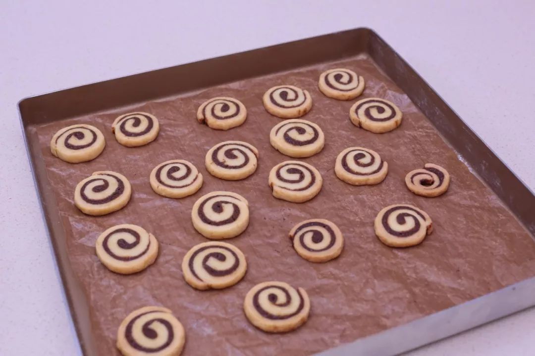整形与烤制:将冷藏好的派皮取出,切掉边缘,均匀地抹上咖啡馅或抹茶馅,然后将其卷起来,放入冰箱冷藏20分钟,取出切成0.5cm的厚度,放入烤箱,170度,中上层20分钟。温馨提示:卷的稍微紧一些,烤出来的纹路没有空隙会更好看哦。